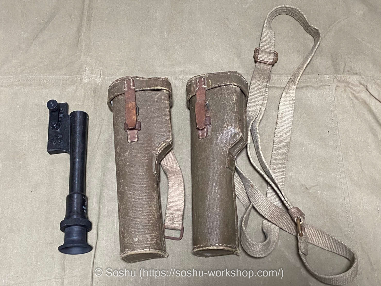 In my private collection, I have carrying cases (Shūyō-nō/収容嚢) for the Type 97 Sniper Scope (Kyūnana-shiki Sogeki Gankyō/九七式狙撃眼鏡), designed for the Type 97 sniper rifle (Kyūnana-shiki Sogeki Jū/九七式狙撃銃). As a matter of fact, I have two of them.