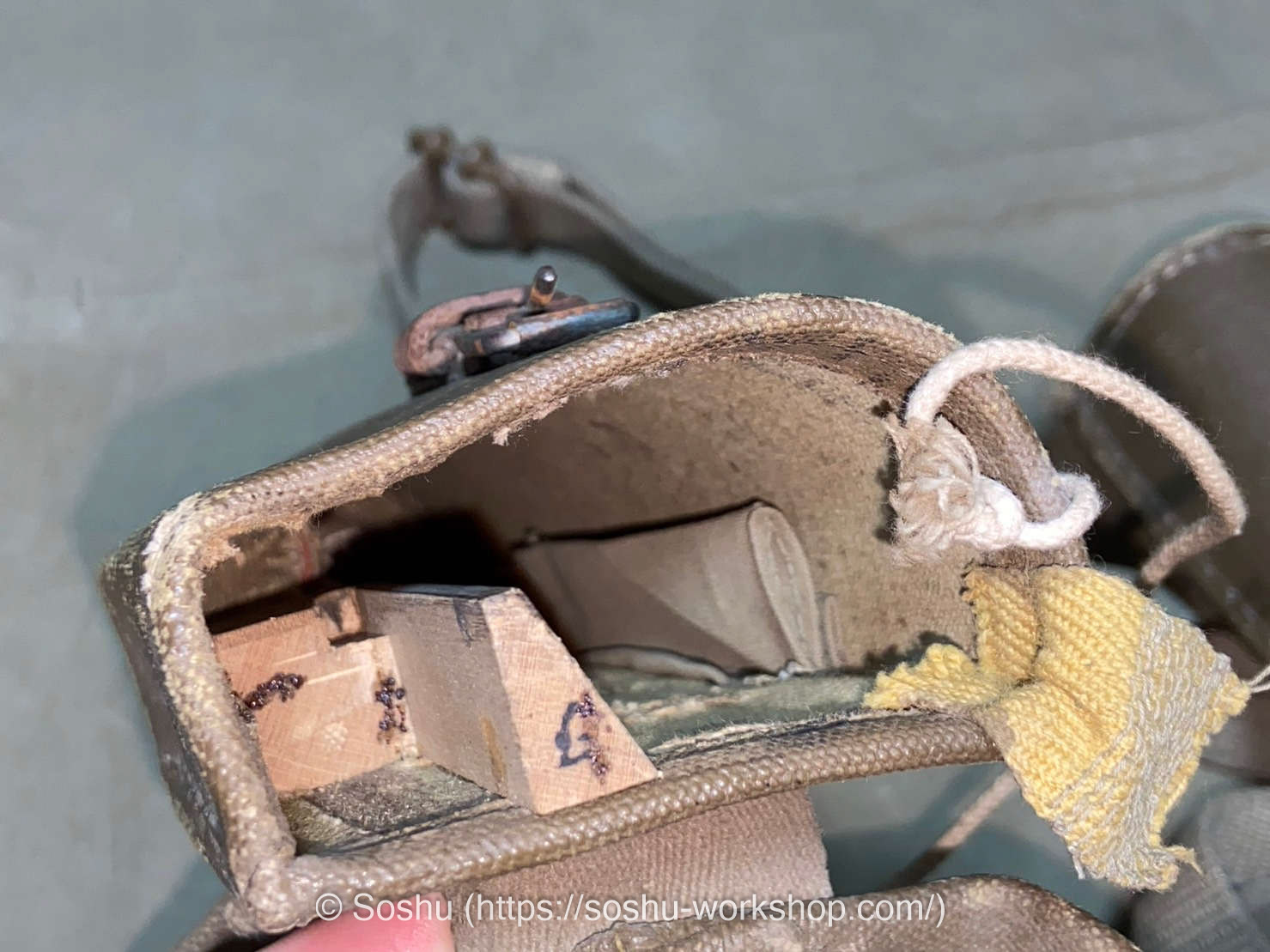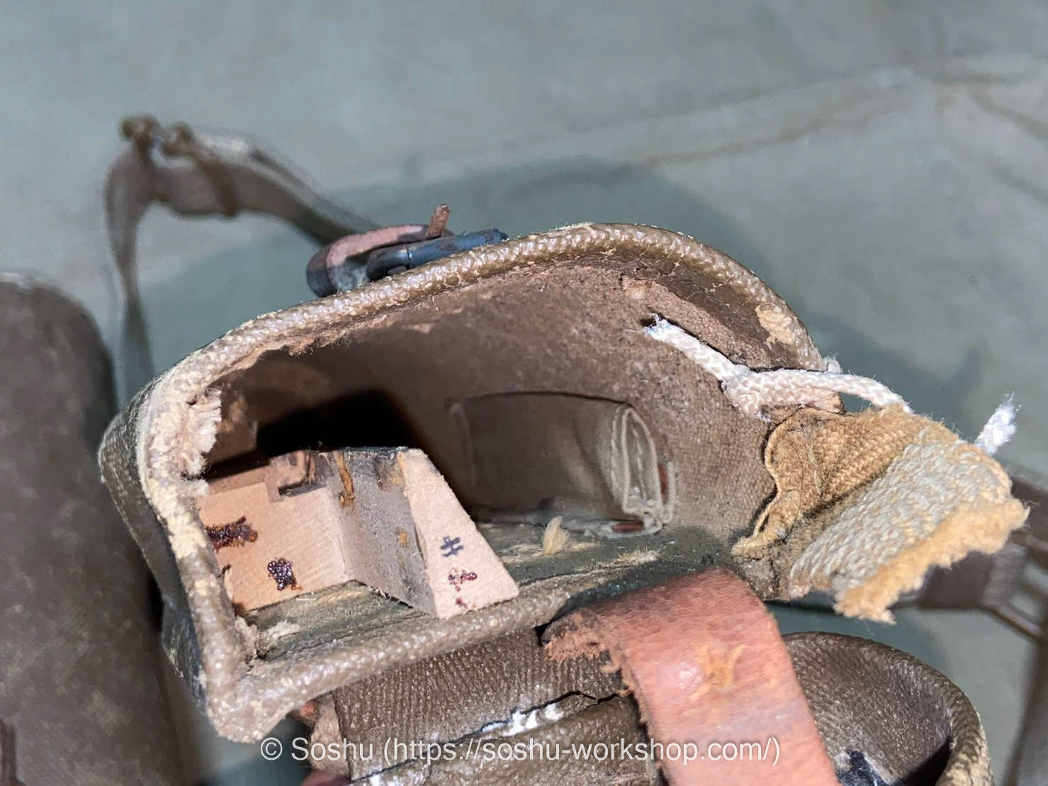 Finally, regarding the shoulder strap, it seems to follow the specifications of the Type 93 Binoculars Case (Kyūsan-siki Sōgankyō-nō). Although the threading of the strap is slightly different, the width of the strap and the shape of the buckle match.