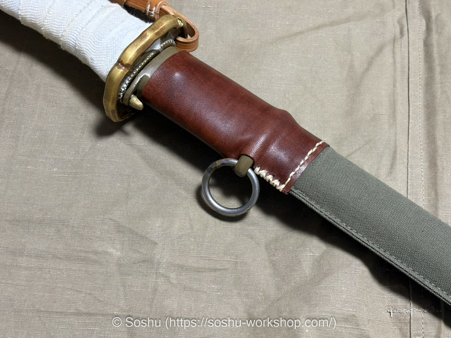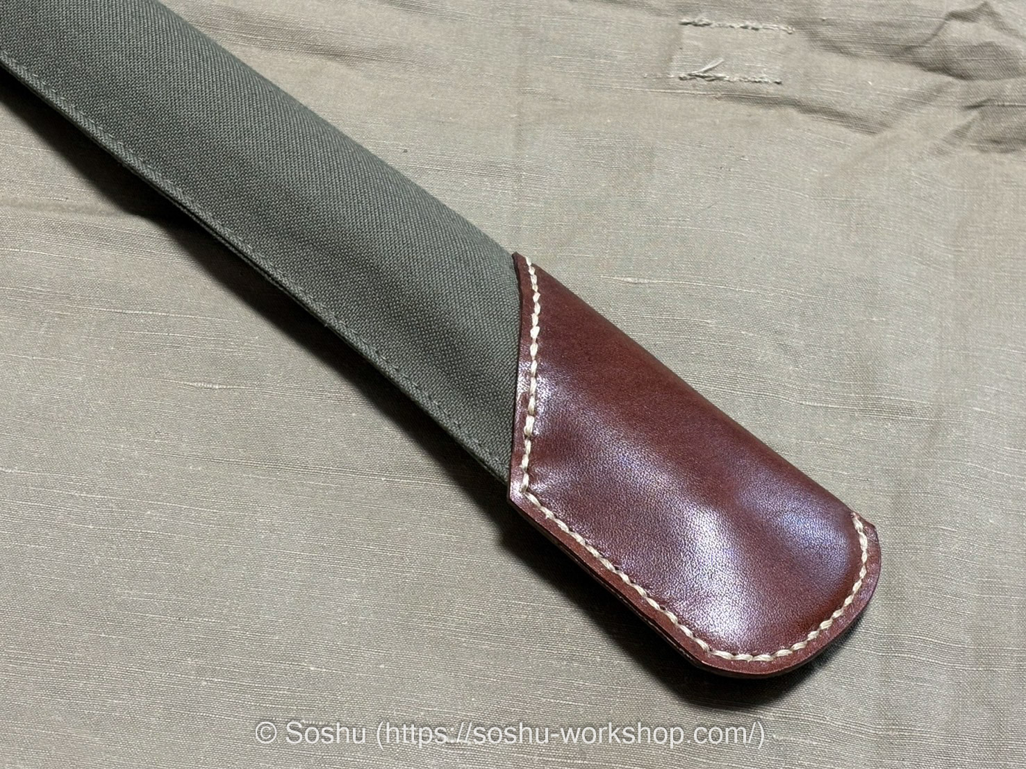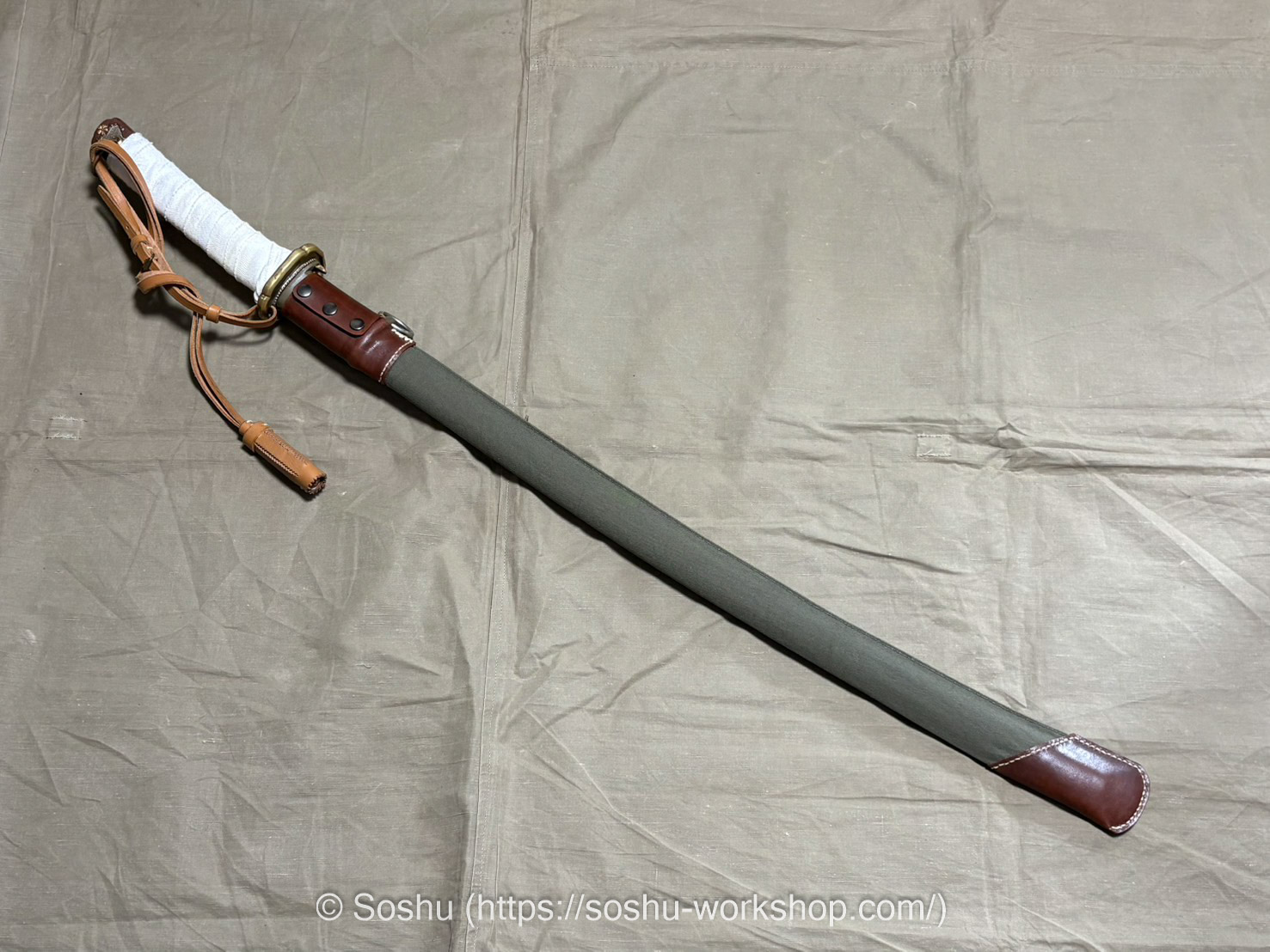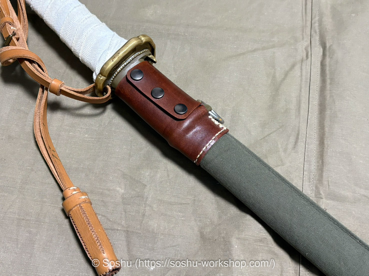 詳しい史料は残っていないため細かい仕様は不明ですが、鞘本体の色に似た防水綿布で作成されたようです。そこで、鞘の色に類似した帆布を使用し、細部は将校用の軍刀鞘覆の構造などをを参考にして、作成しました。詳細はこちらの記事をご覧ください。