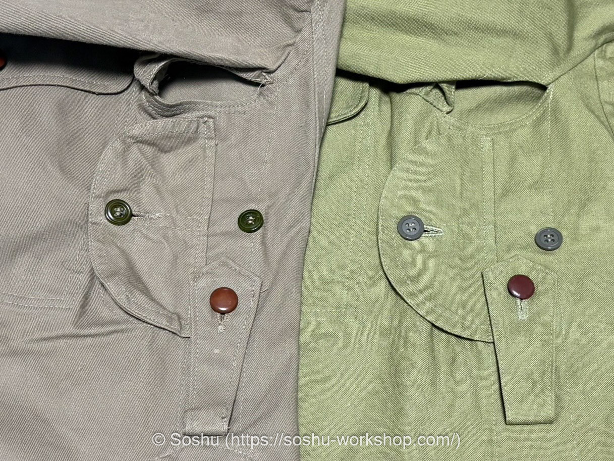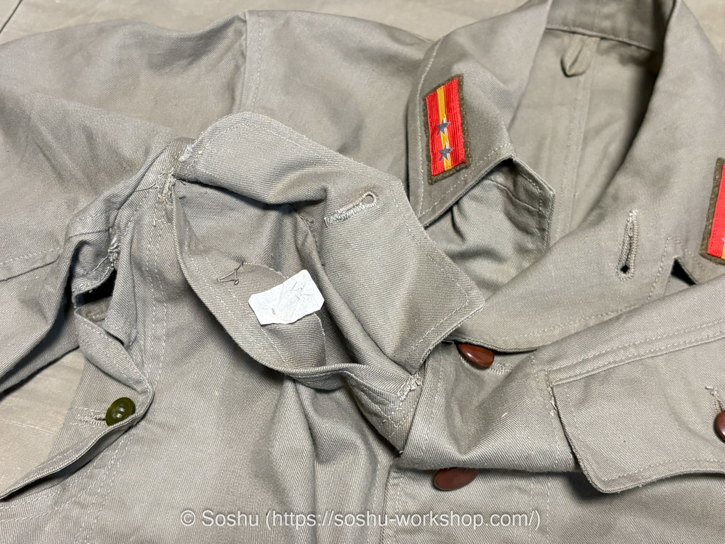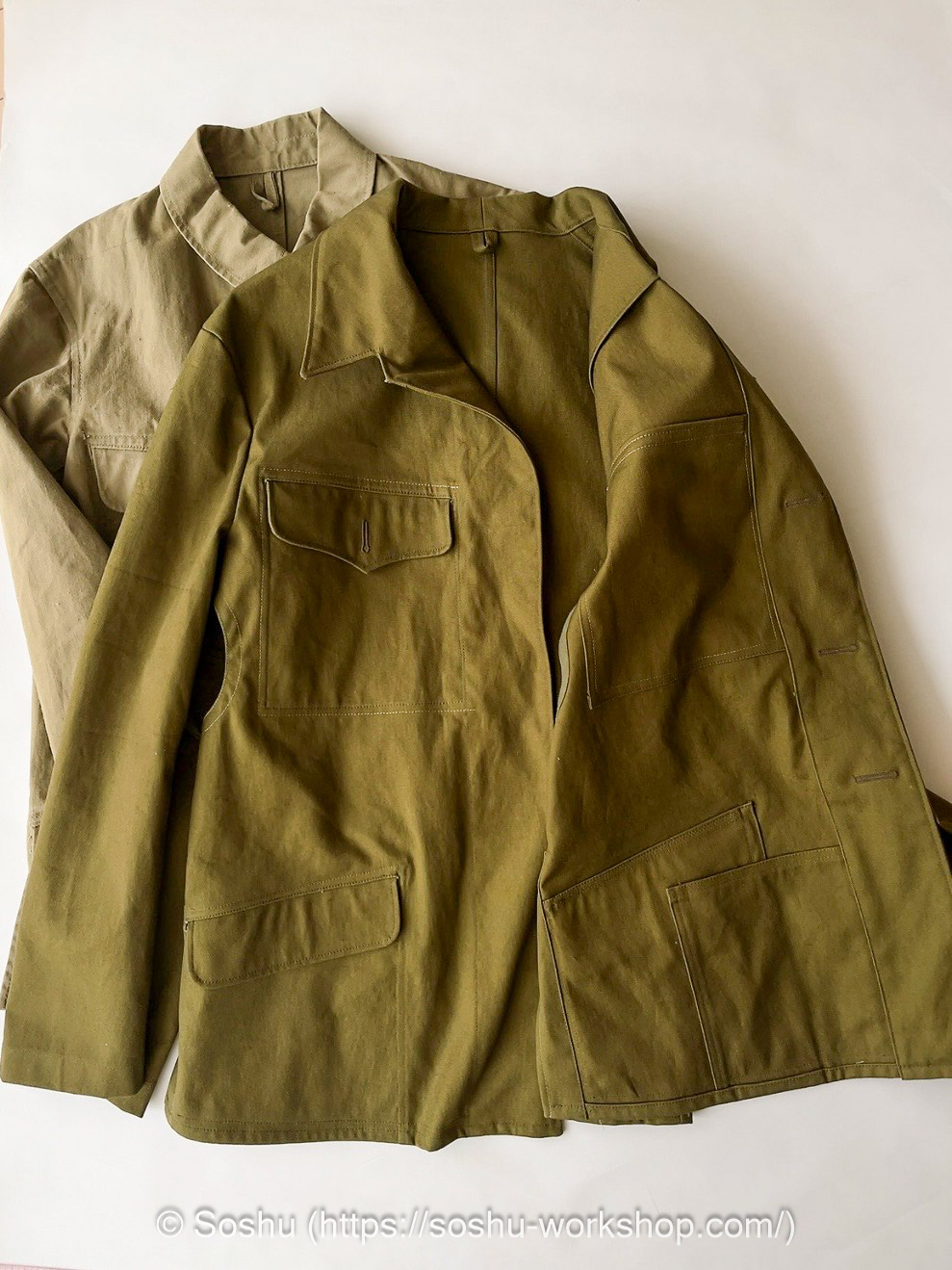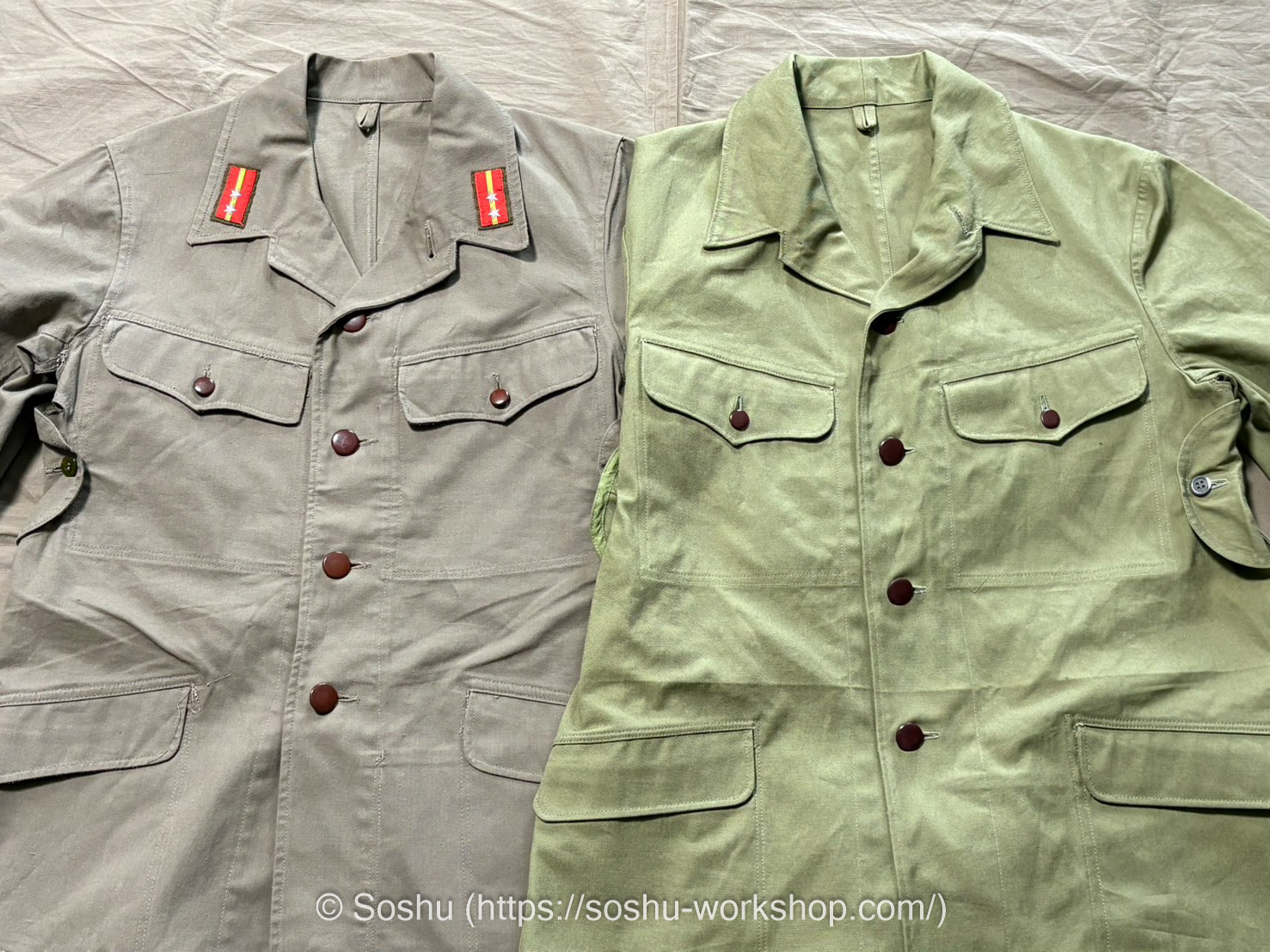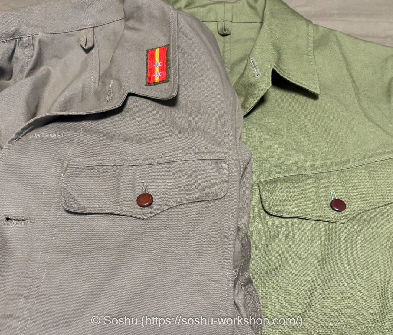 左側が実物の九八式夏衣、右側がレプリカです。こちらはやや濃い色味ではありますが、全体の色調は実物に近い印象です。