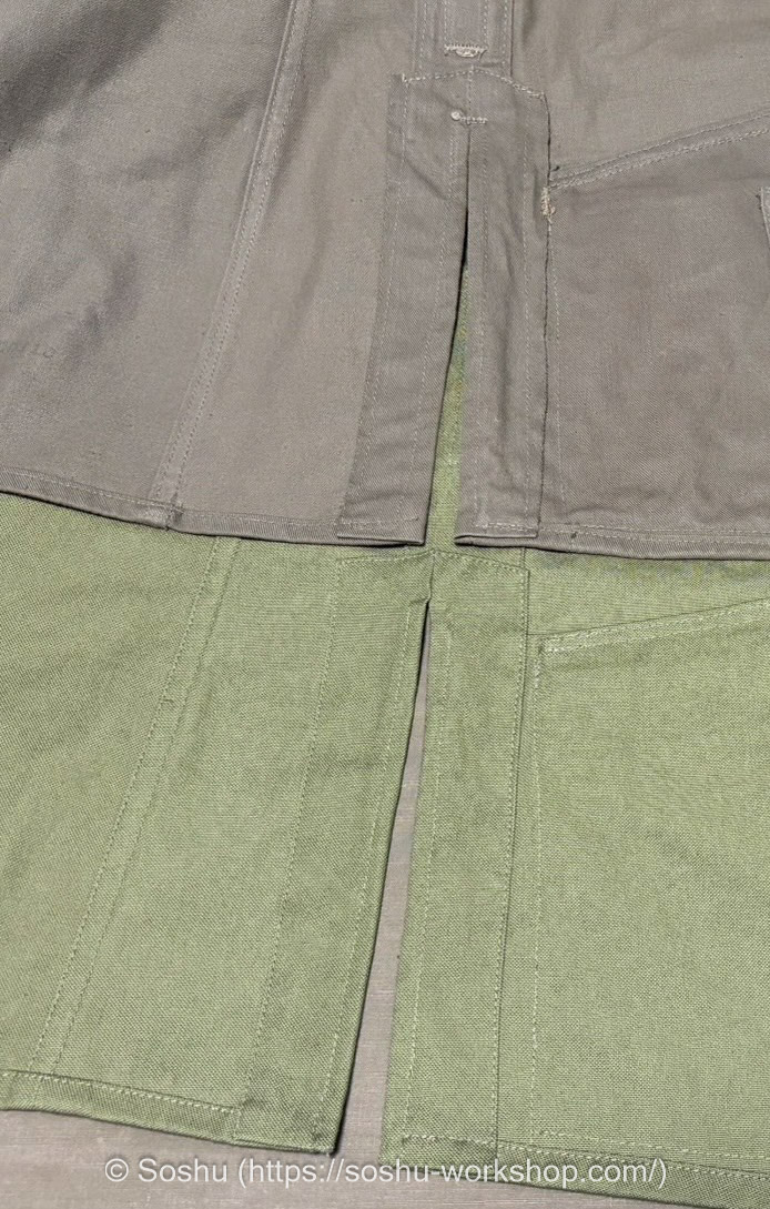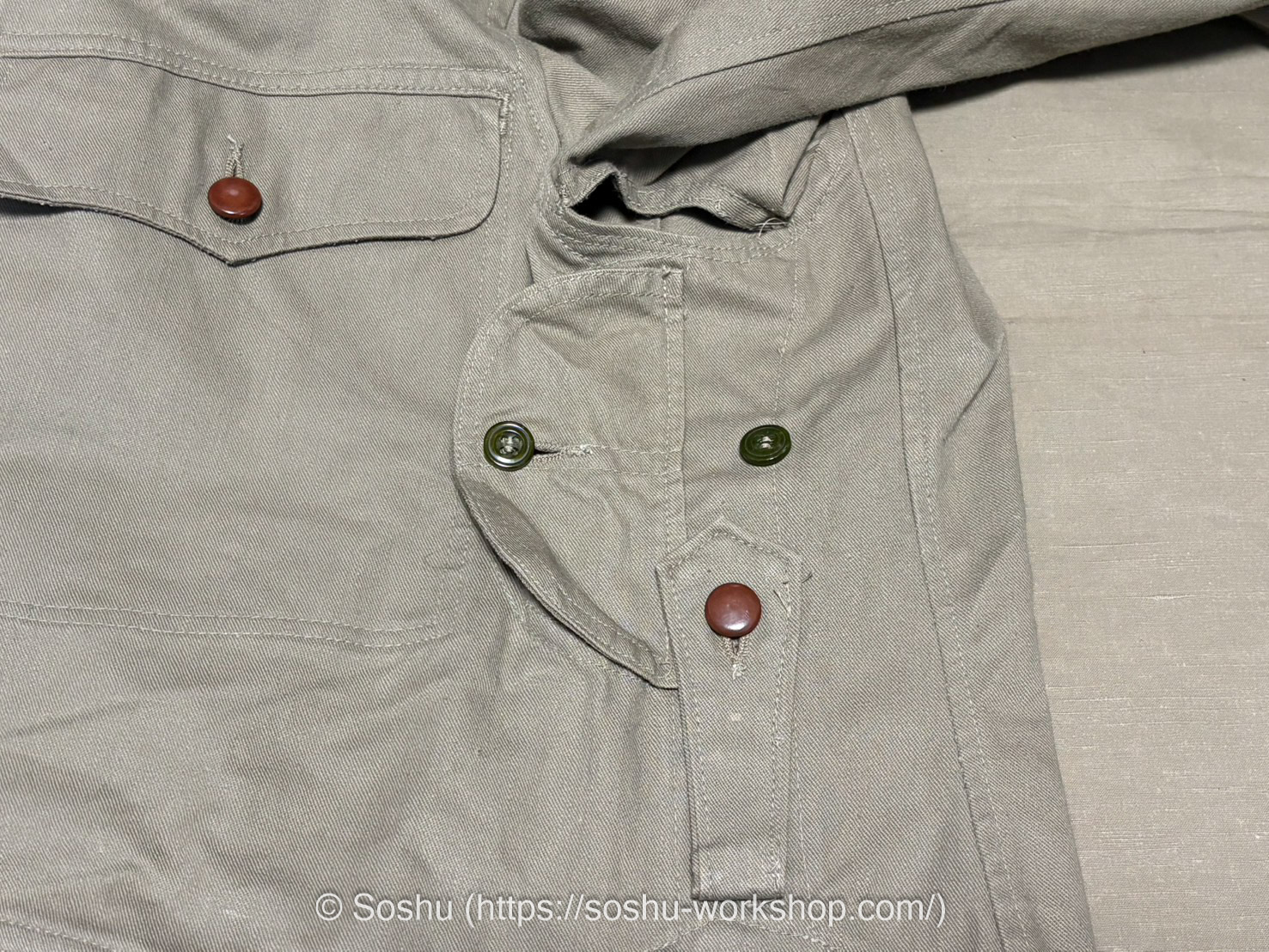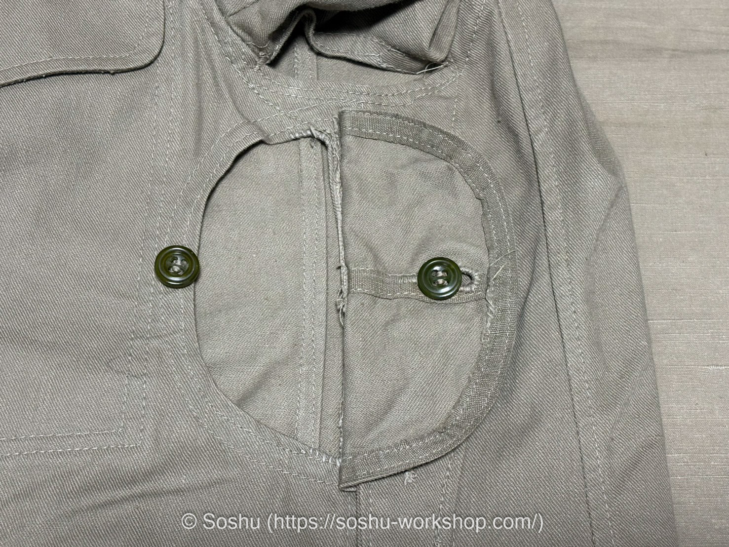 昭和17年制は通気孔の蓋が大きく、剣留と干渉しています。また、脇の下にも九八式夏衣と同様に通気孔が空いていますが、この通気孔は昭和13年制には見られません。