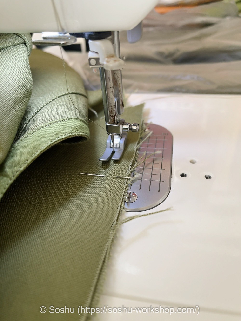 縫製については、実物よりも丁寧に行っています。実物ではミシン目の飛びや縫い目の歪み、左右の非対称などが見られ、昭和18年頃には熟練工の減少といった背景もあったのではないかと推察されます。