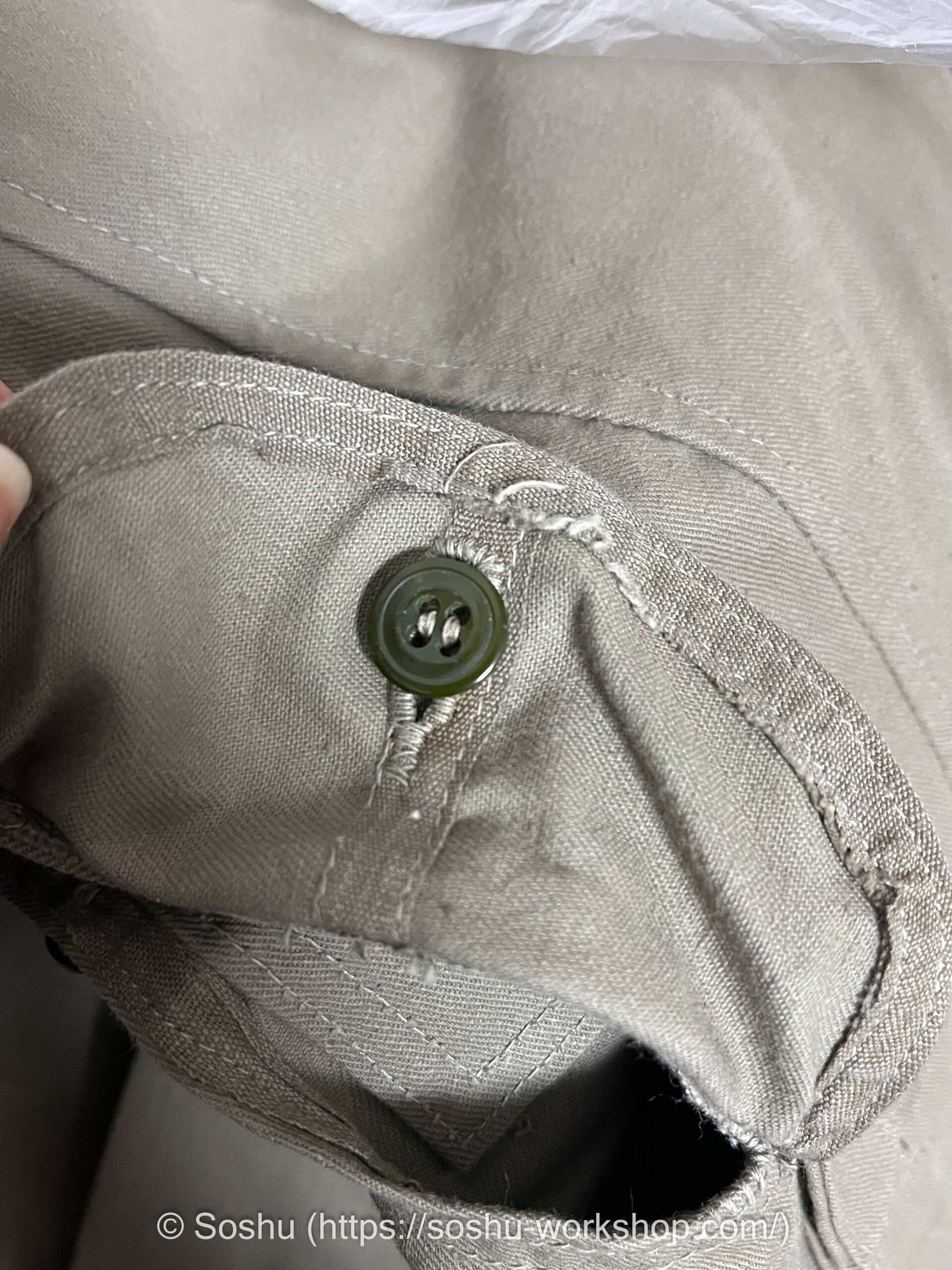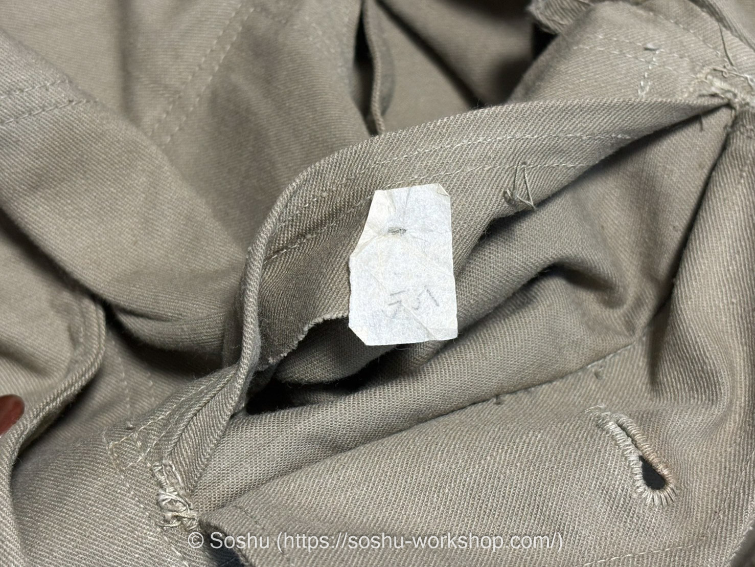 右胸の物入のボタン裏には、小さな白いタグが付いたまま残っていました。「ラ5」と読めるようですが、その意味は不明です。このようなタグが残存している点から、本個体は未使用品ではないかと考えられます。