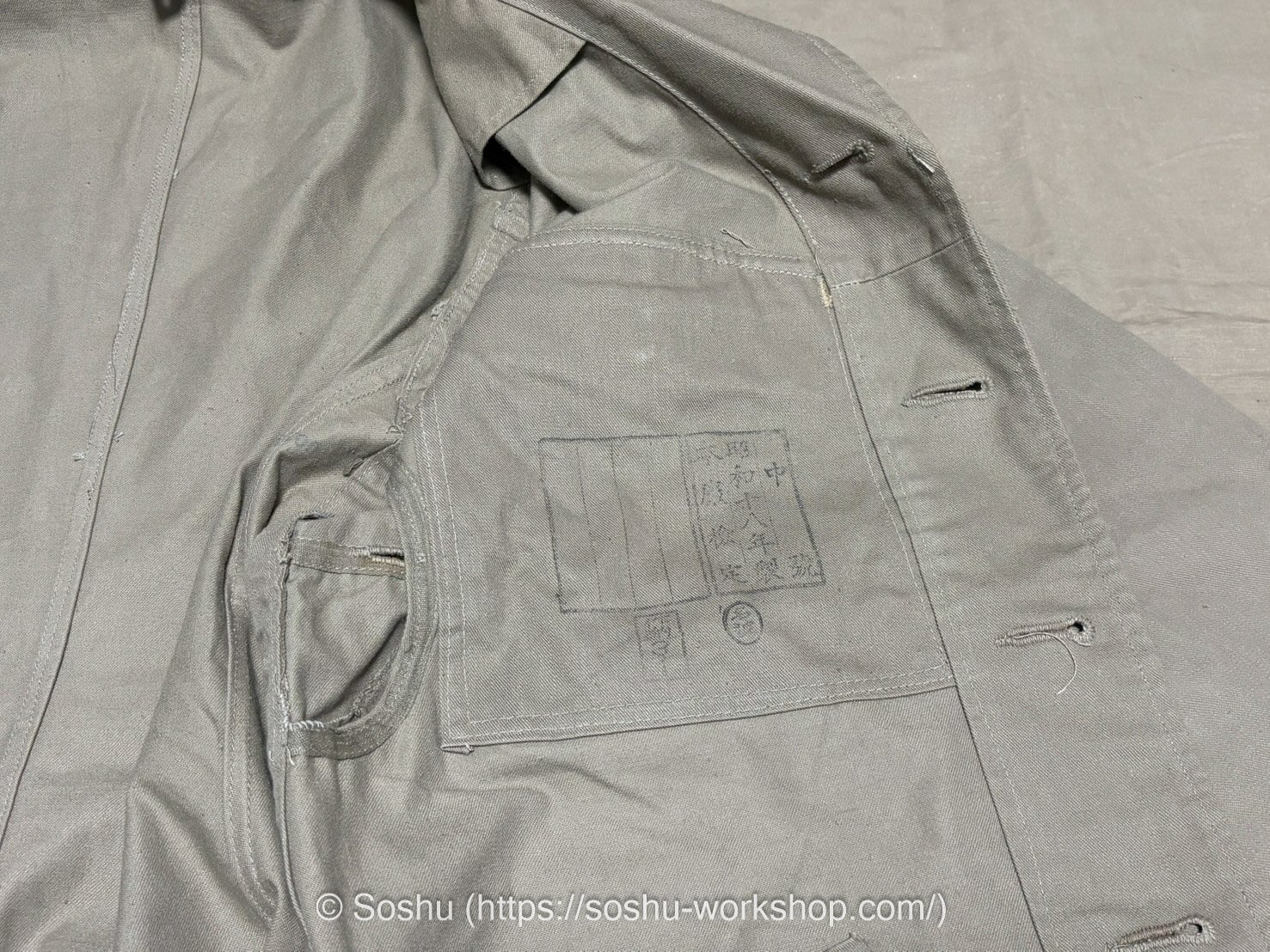 懐に押された検定印です。「中號 昭和十八年製 本廠検定」と読めます。当時の「中號」は、おおよそ現代のSサイズに相当し、身長160cm未満程度の体格に対応しています。