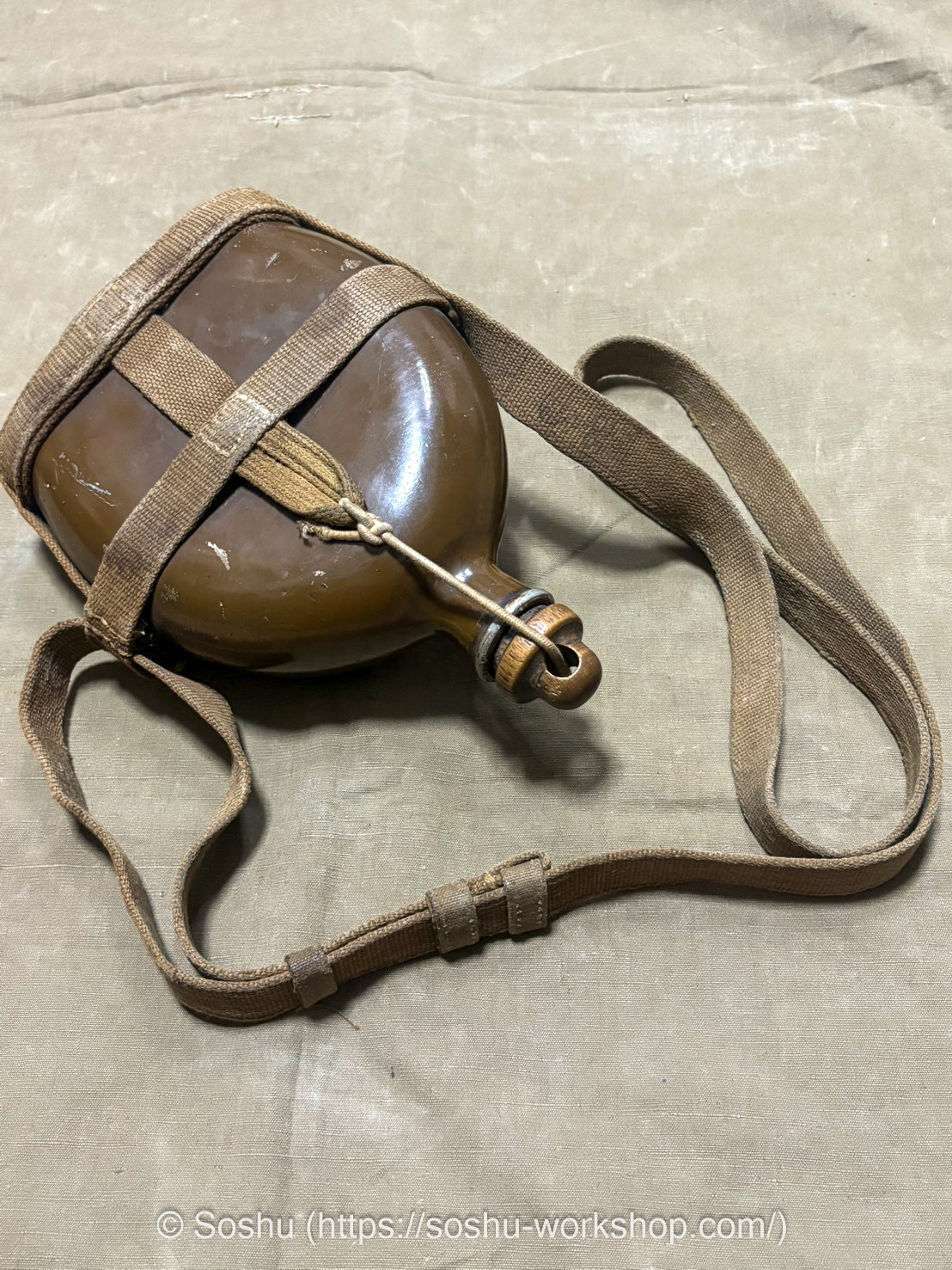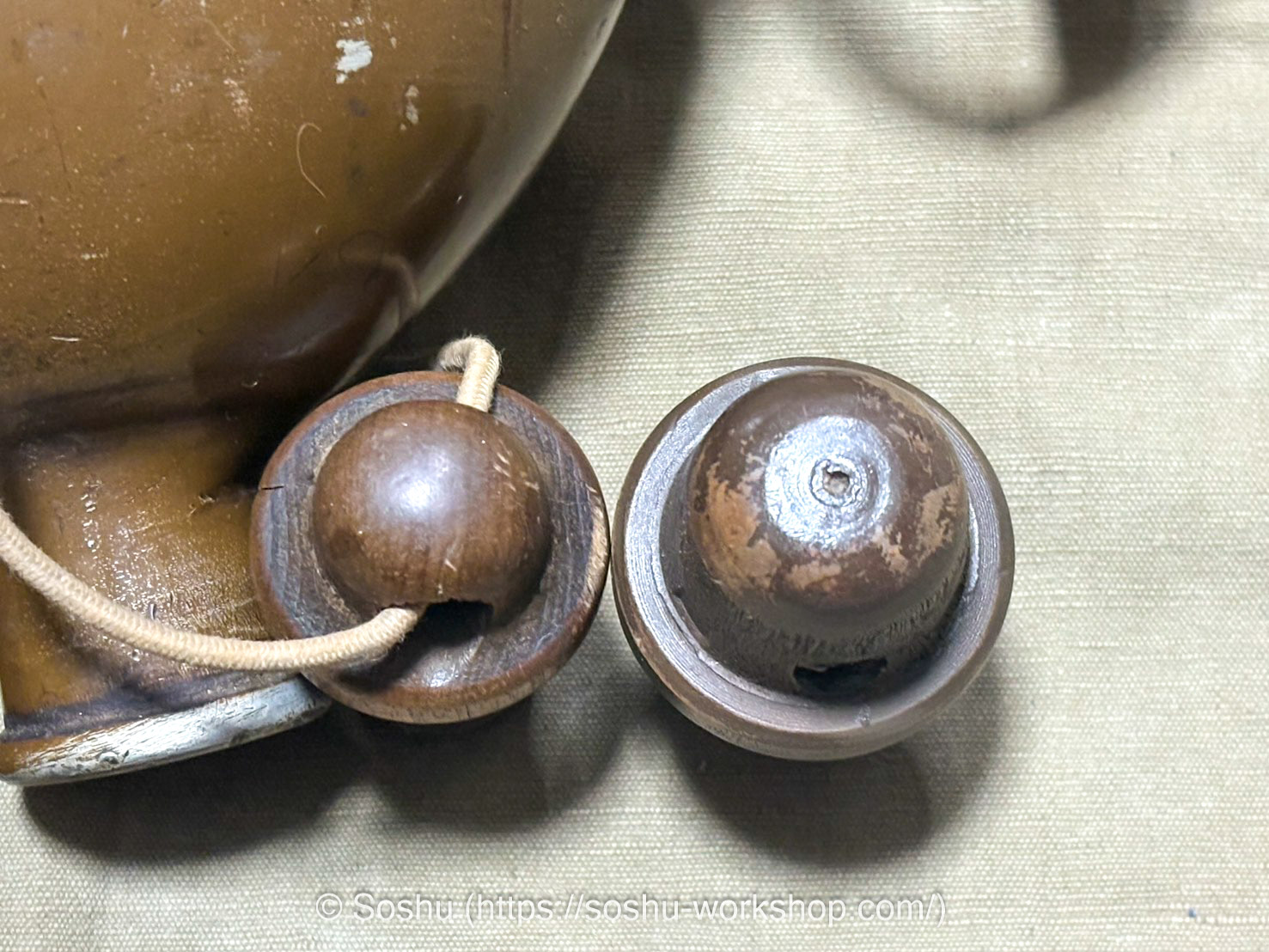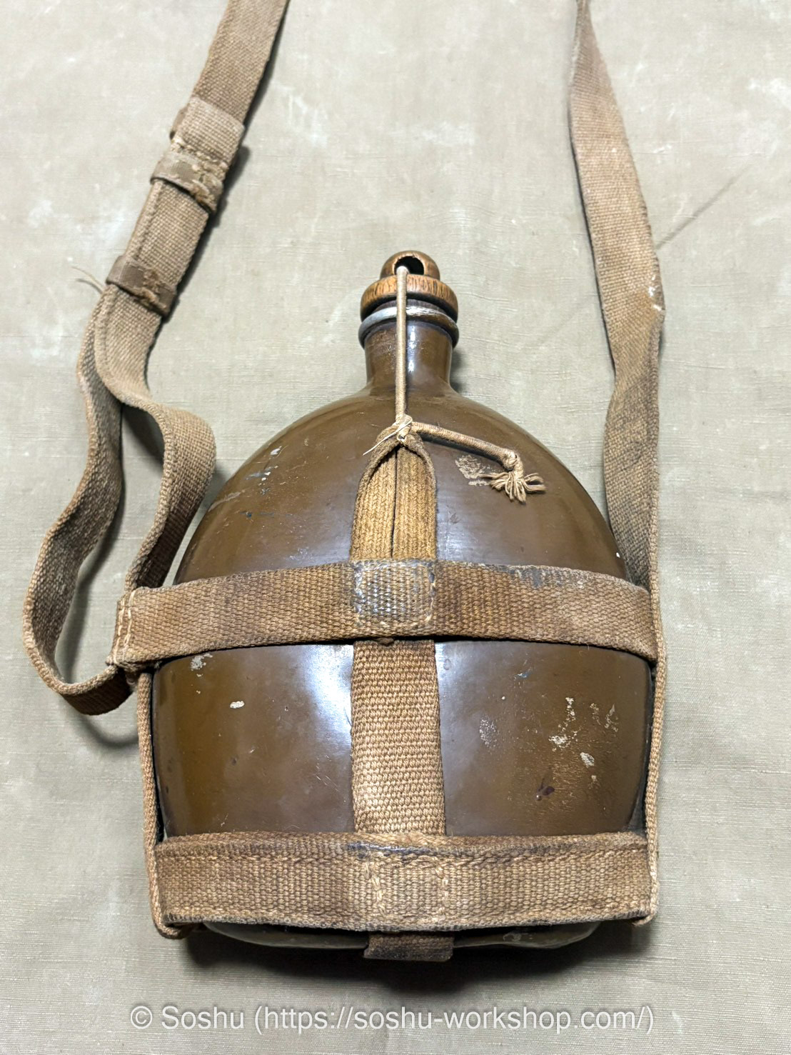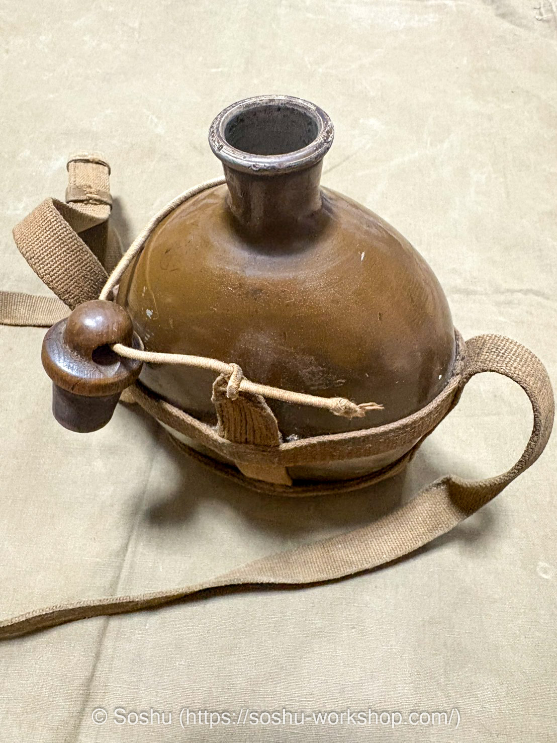 この水筒は、徳利型の旧型水筒に似ているのですが、よく見ると少し形状が異なります。民間用水筒か何かを流用しているのかもしれません。